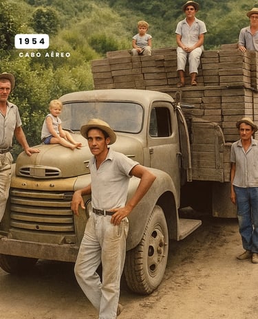 O registro do momento em que o homem finalmente domina o traçado da montanha. Onde antes havia apenas trilhas íngremes e perigosas, surge o caminho que permitiria o acesso de veículos ao topo da Serra.
