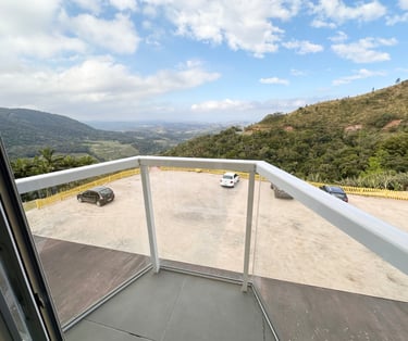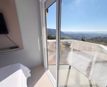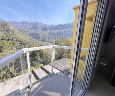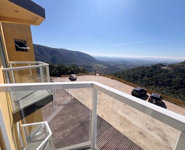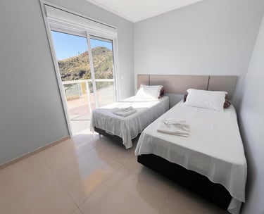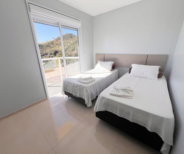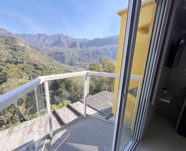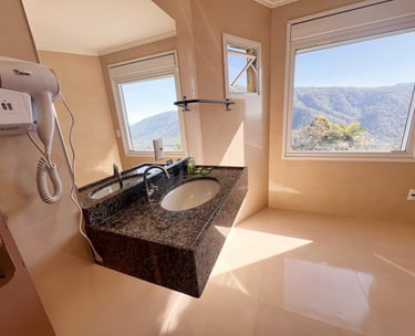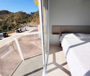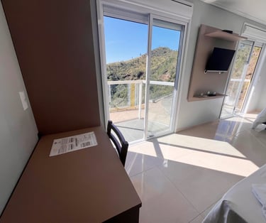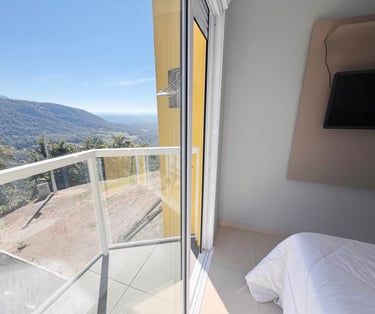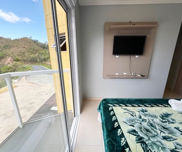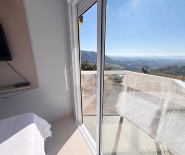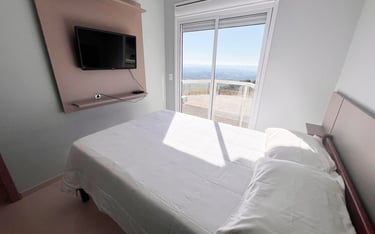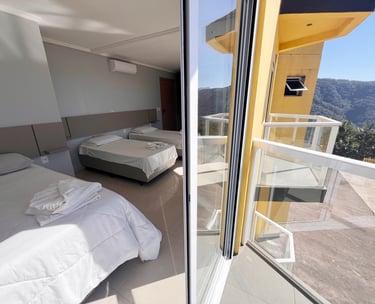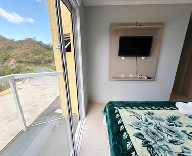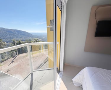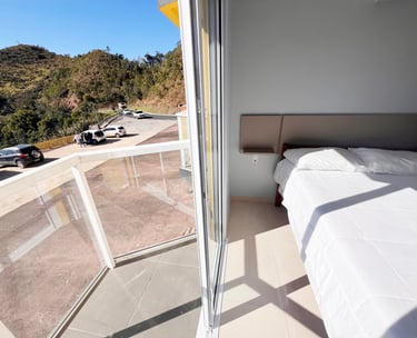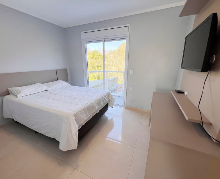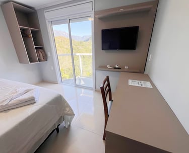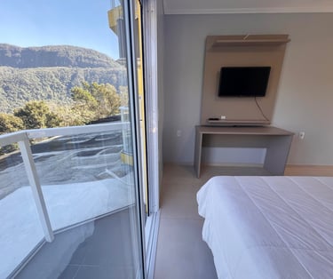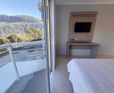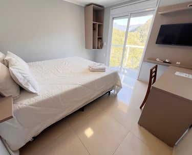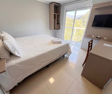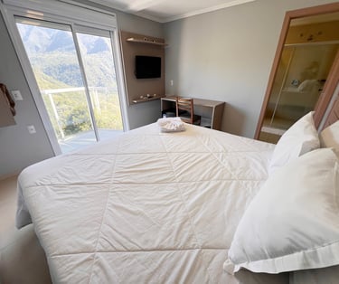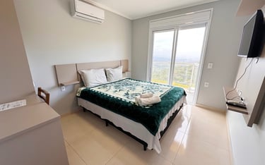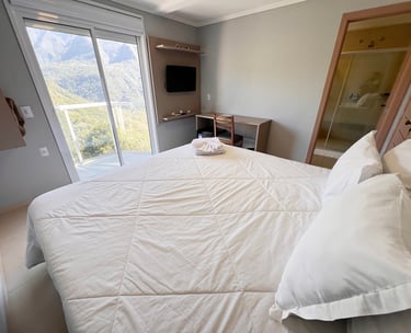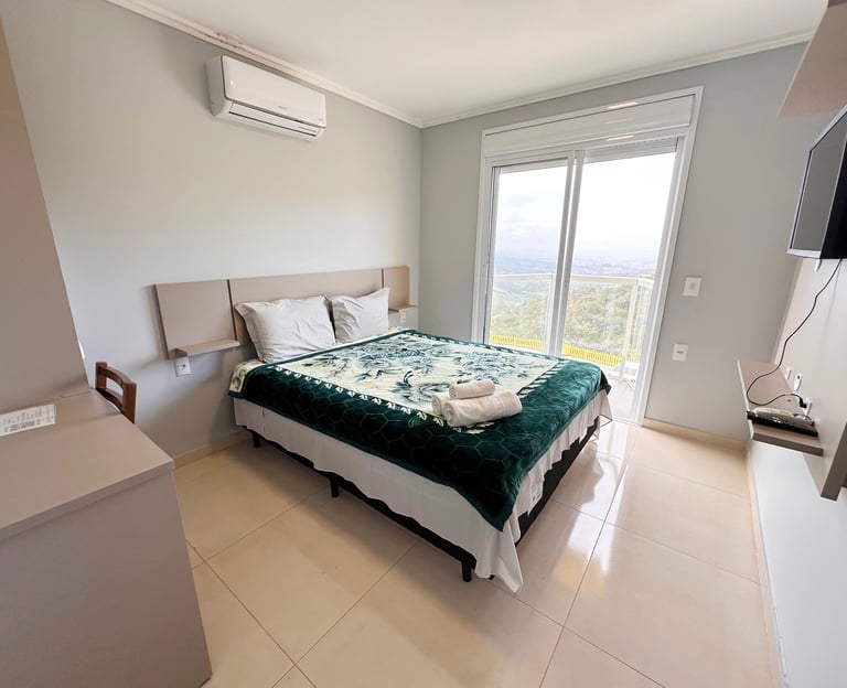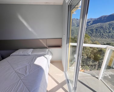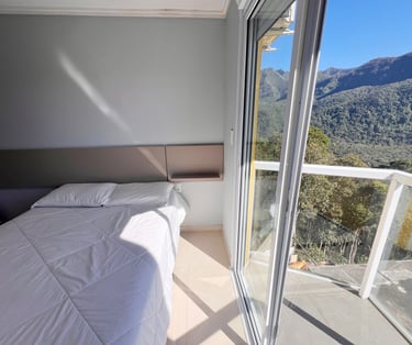 Quarto aconchegante com vista para a serra, perfeito para relaxar após um dia de aventuras.